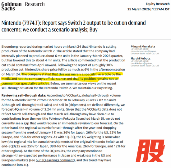 2026 年 3 月 26 日消息,针对昨日彭博社(Bloomberg)发布的一份关于 Switch 2 产量大幅缩减的负面报告,任天堂官方今日打破沉默,通过一份发给高盛(Goldman Sachs)的声明进行了强势回击。任天堂明确表示,该报道内容“纯属推测”,完全不能反映公司的真实立场。